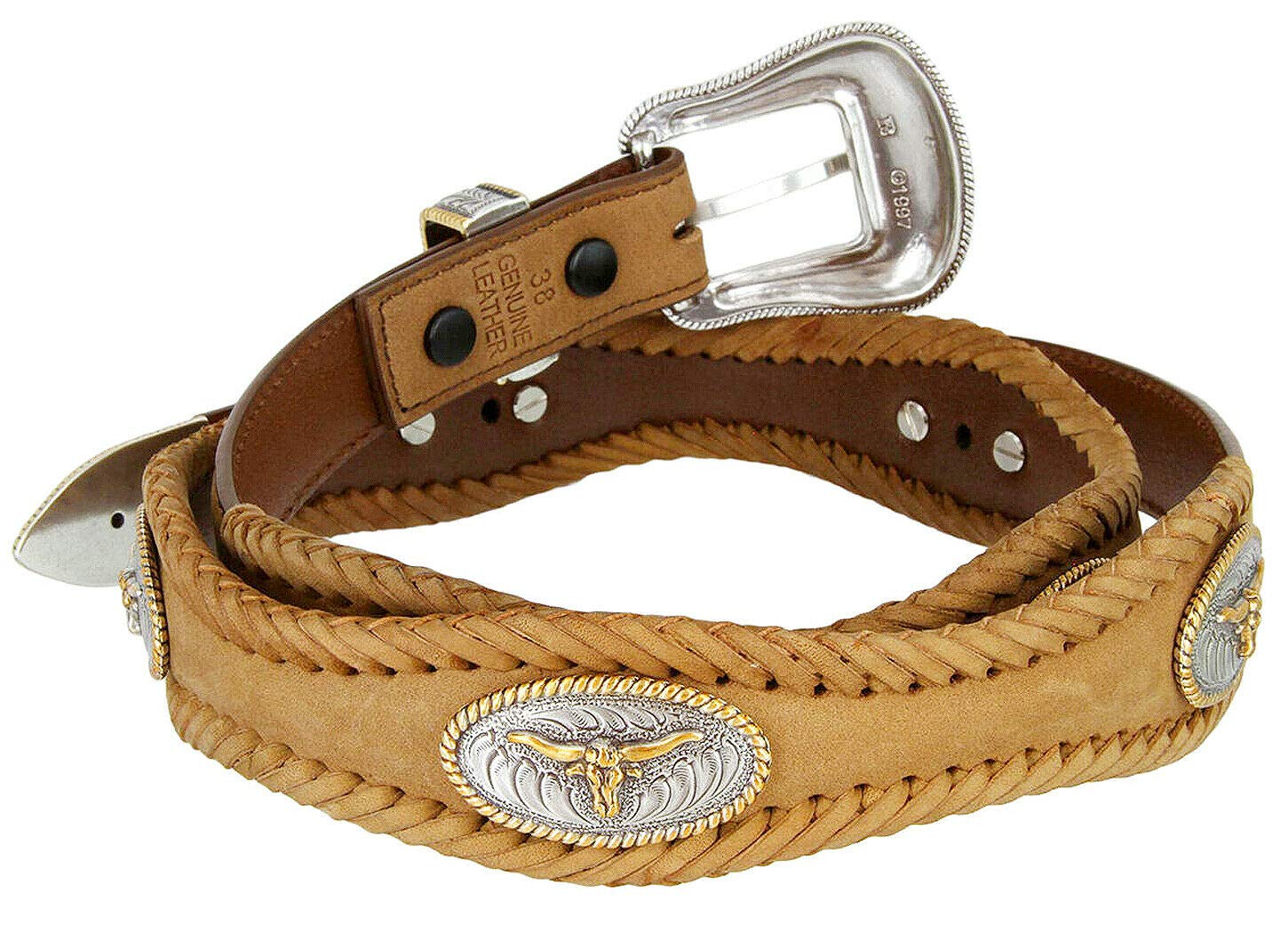 Longhorn Steer/Gold Star Conchos Ranger Belt Western Cowboy Cowgirl Genuine Leather Braided Belt, Size Up to 60"
